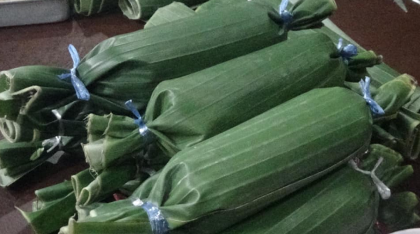๕. นำเอาเข้าเหนียวที่พักไว้ ห่อกับใบตอง ให้มีความยาวพอสมควร เเละเอาเชือกมัดหัวและท้าย